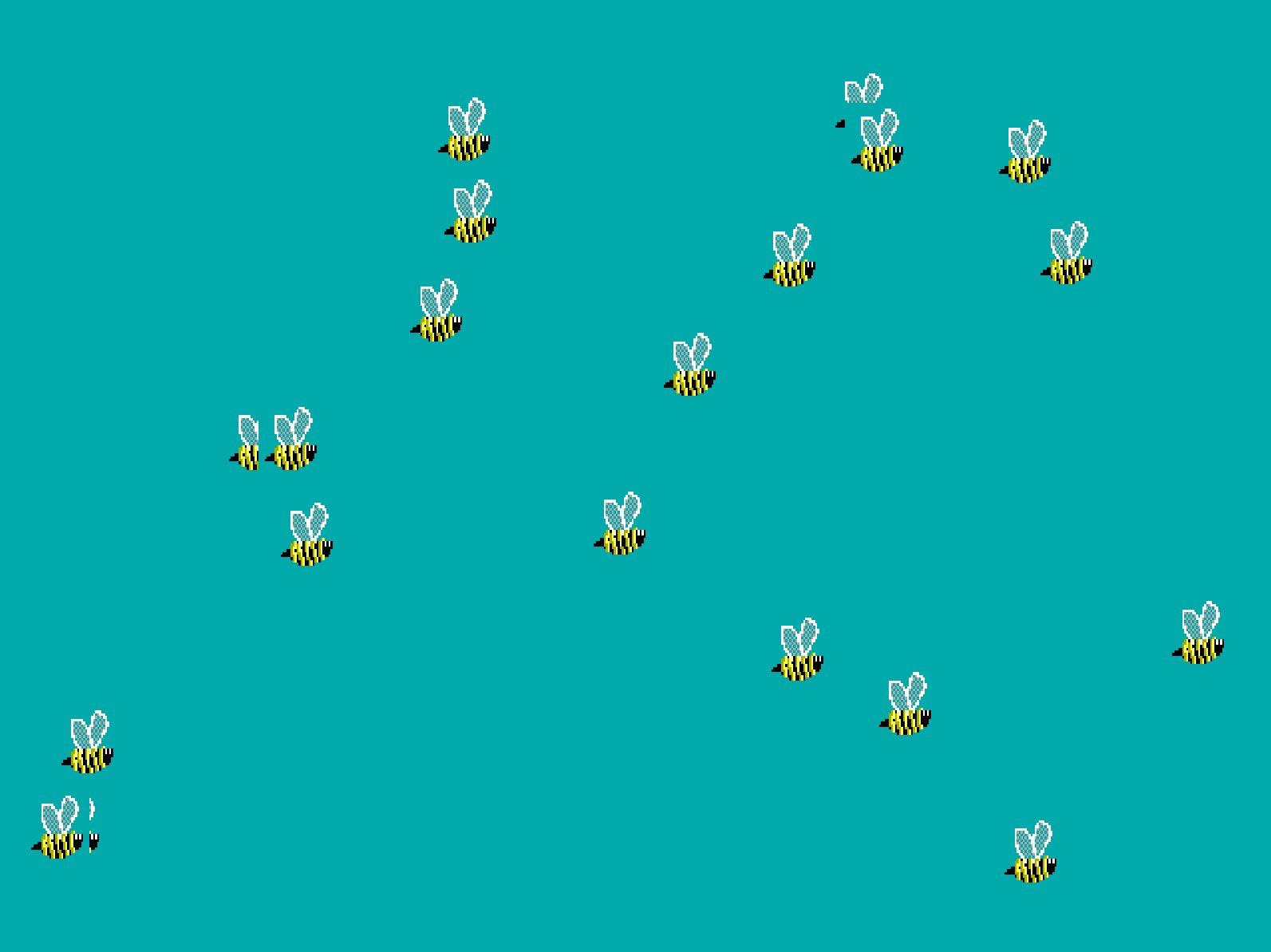 BEES.EXE is a silly little art thing. I drew a bee in Aseprite, then had a lot of !!Fun!! attempting to get that sprite into QBasic, where I made a bunch of bees bumble around.